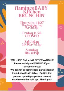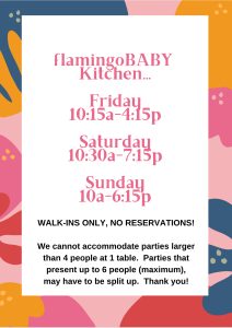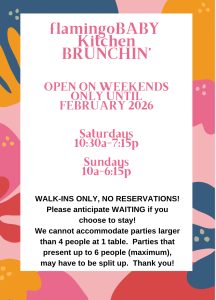 Prev 1 2 3 4 Next Brunch Weekday Kids Menu Drinks mon – THURS closed fri 10 AM – 4:15 pm Saturday 10:30 am – 7:15 pm Sunday 10 am – 6:15 pm